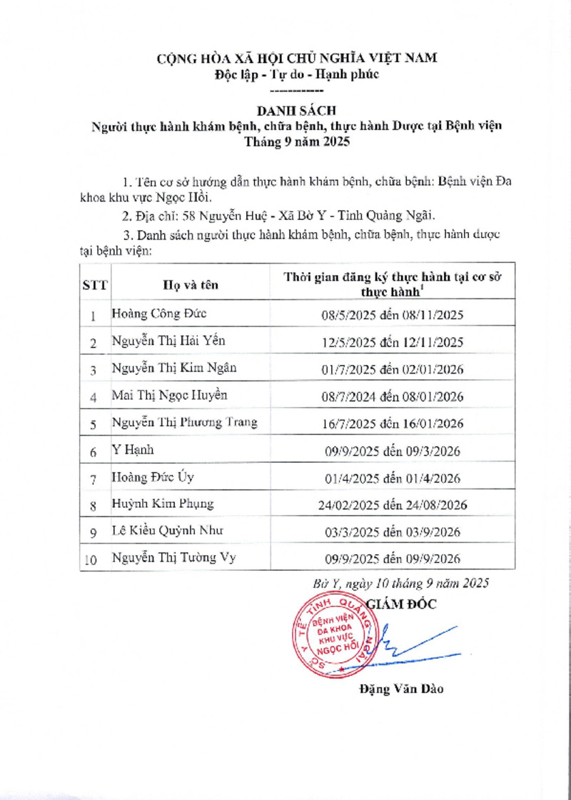 | Tiêu đề văn bản | Danh sách người thực hành khám bệnh, chữa bệnh, thực hành Dược tháng 9/2025 tại Bệnh viện Đa khoa khu vực Ngọc Hồi | ||