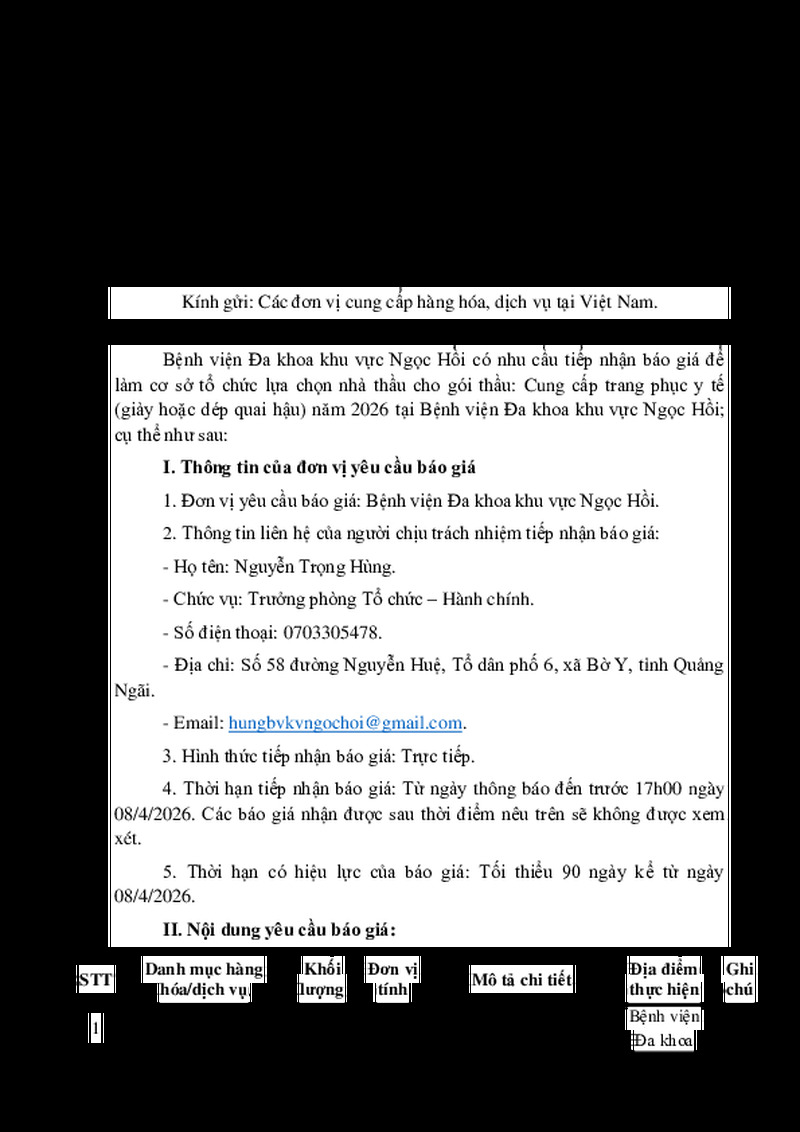 | Tiêu đề văn bản | Thông báo về việc yêu cầu báo giá gói thầu: Cung cấp trang phục y tế (giày hoặc dép quai hậu) năm 2026 tại Bệnh viện Đa khoa khu vực Ngọc Hồi | ||